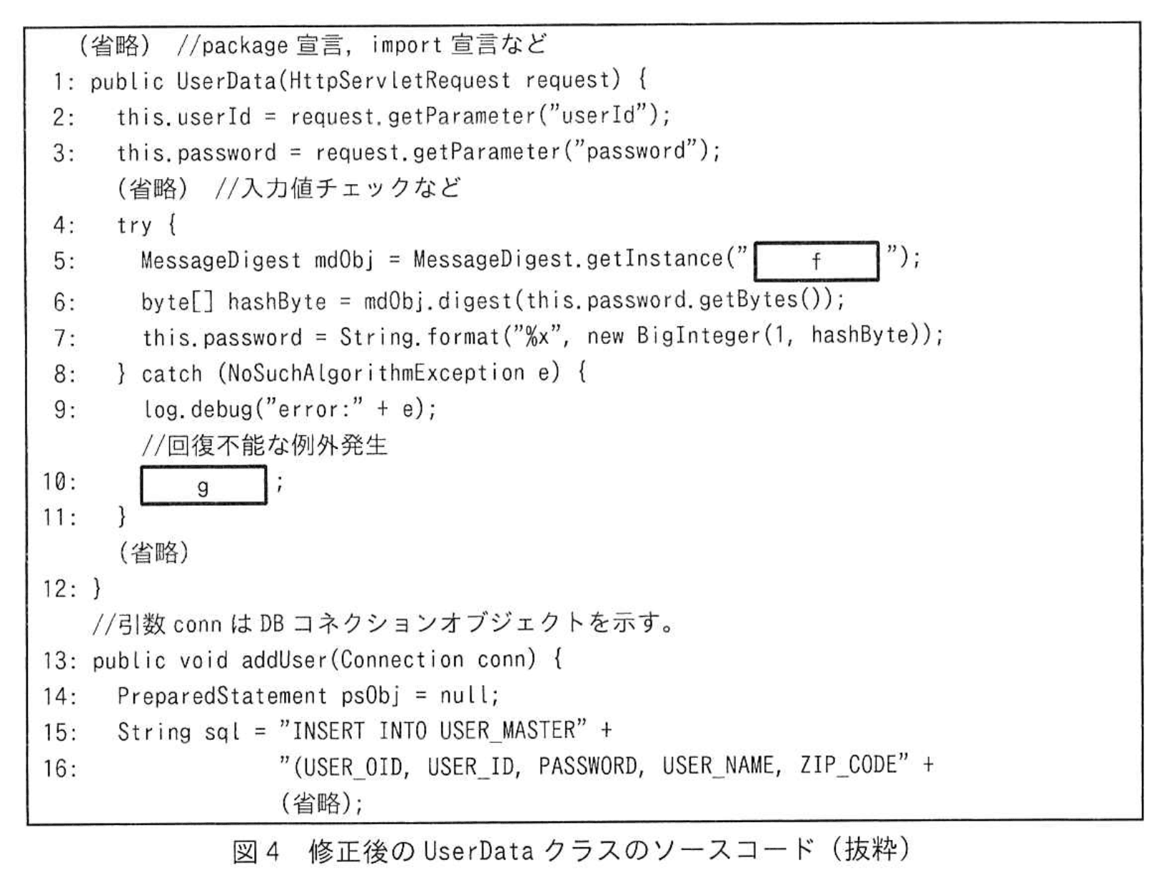 (7)本文中の下線②について、図4の6、7行目をどのように修正すればよいか。修正後の適切なソースコードを解答群の中から選び、記号で答えよ。ここで、変数saltには、addUserメソッドの呼出しごとに異なる32バイトの固定長文字列が入っているものとし、ユーザーマスターテーブルの定義に変更はないものとする。