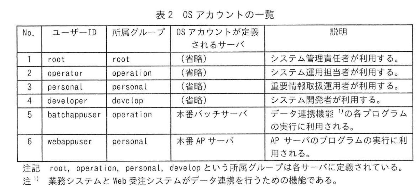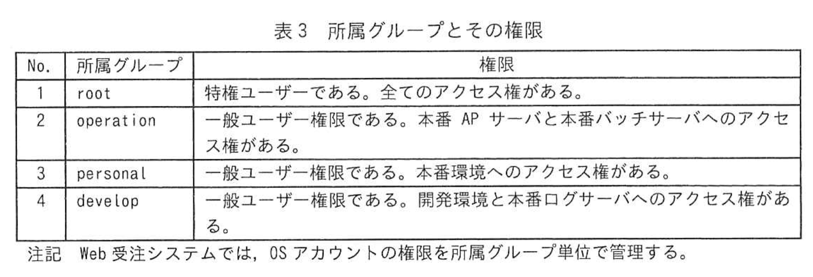 Web受注システムのサーバで定義されるOSアカウントの一覧を表2に、所属グループとその権限を表3に示す。