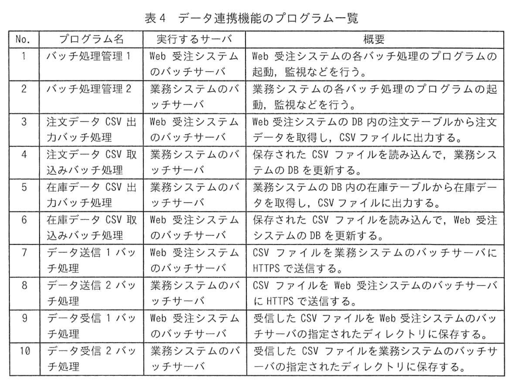 業務システムとWeb受注システムは、CSV形式のデータ連携用ファイル(以下、CSVファイルという)でデータ連携を行う。1時間ごとに業務システムのバッチサーバとWeb受注システムのバッチサーバにおいてCSVファイルを作成し、HTTPSで他方のバッチサーバに送信し、他方のバッチサーバでは受信したCSVファイルを保存する。保存したCSVファイルを使用してWeb受注システム又は業務システムのDBに対して更新処理を実行する。更新処理後のCSVファイルは、障害発生に備えて1週間保存する。