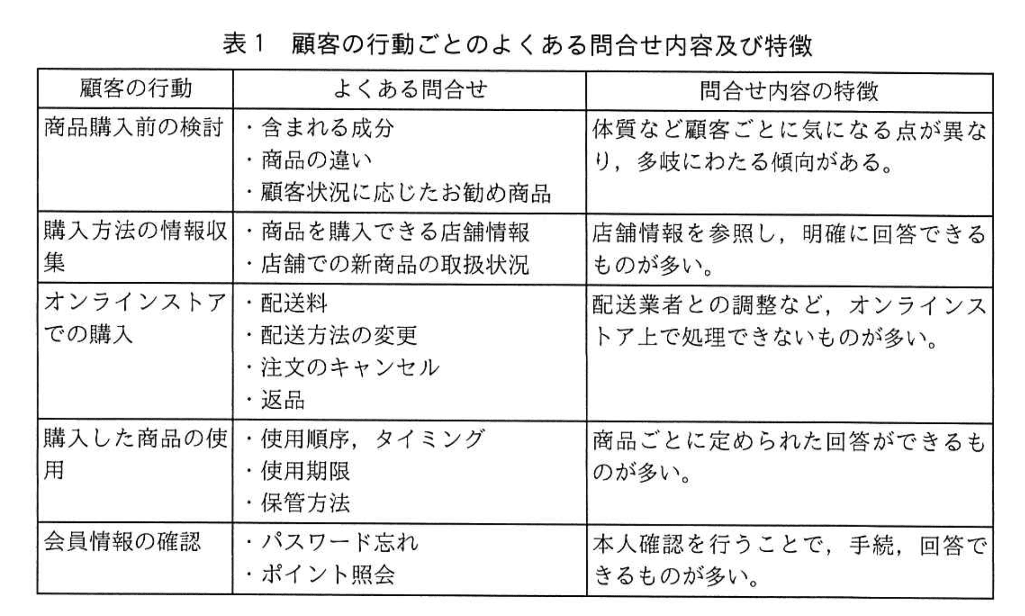 また、A社では、四半期に一度、問合せ内容の統計をとり、分析して、よくある問合せ内容について、A社のWebサイト上に、FAQとして掲載し、情報発信している。電話及びWebフォームからの問合せ内容は、顧客の行動に応じて様々である。よくある問合せ内容及び特徴を表1に示す。