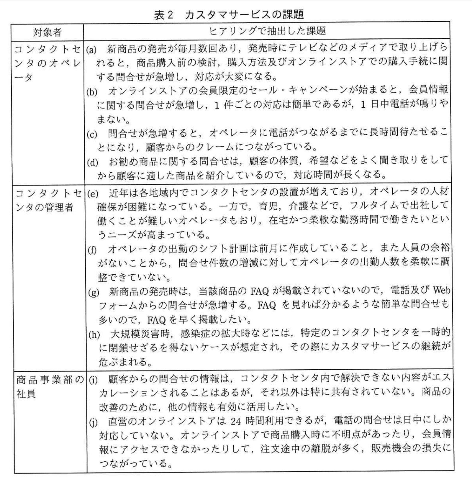 A社では、コンタクトセンタで勤務するオペレータ及び管理者並びに商品事業部の社員に対してカスタマサービスの現状についてヒアリング調査を行い、表2に示す課題を抽出した。