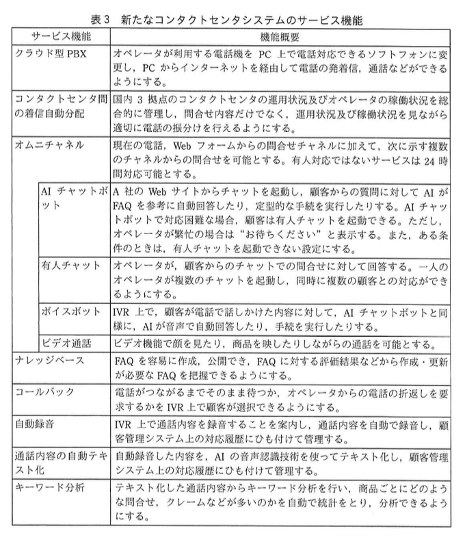 〔新たなコンタクトセンタシステムの構築〕 カスタマサービスの課題を踏まえて、A社では、表3に示すサービス機能を有する新たなコンタクトセンタシステムを構築することにした。 なお、これらの機能はコンタクトセンタのオペレータ及び管理者向けの機能であるが、ナレッジベース及びキーワード分析の機能は、商品事業部の社員も利用できることにした。